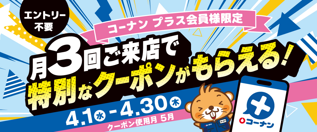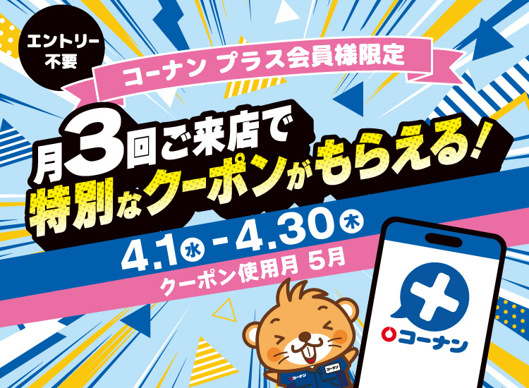 | キャンペーン概要 | コーナンプラス会員様限定!対象期間中、対象店舗で3日以上お買い物(※)をすると、もれなく5月に使える特別クーポンを配布いたします! ※ 月3日以上のご来店で合計1,000円以上のお買上が必要となります |