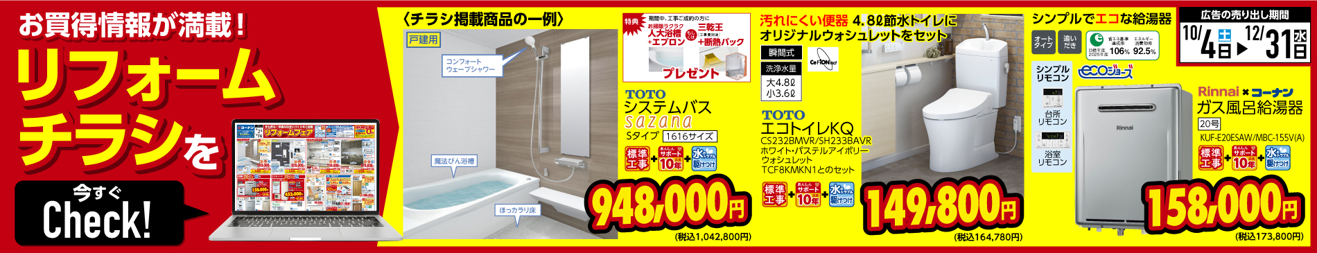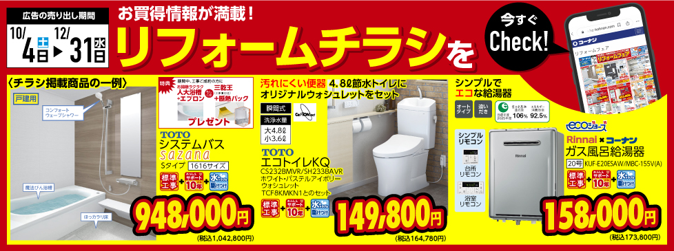 Rinnai×コーナン ガス風呂給湯器 壁掛 20号 エ…2025年12月31日まで 158,000円(税抜) 173,800円(税込)