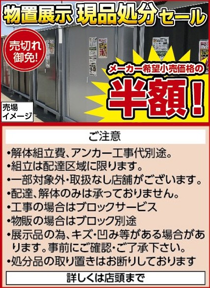 - 2026.1.8から 半期に一度の物置展示現品半額処分セール!!