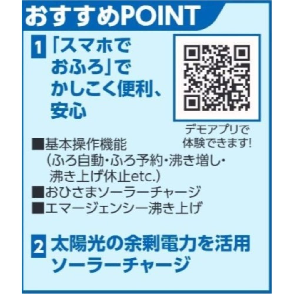 ●スマホでお風呂:スマートフォンから簡単操作→基本操作機能:ふろ自動、ふろ予約、沸き増し、沸き上げ休止等