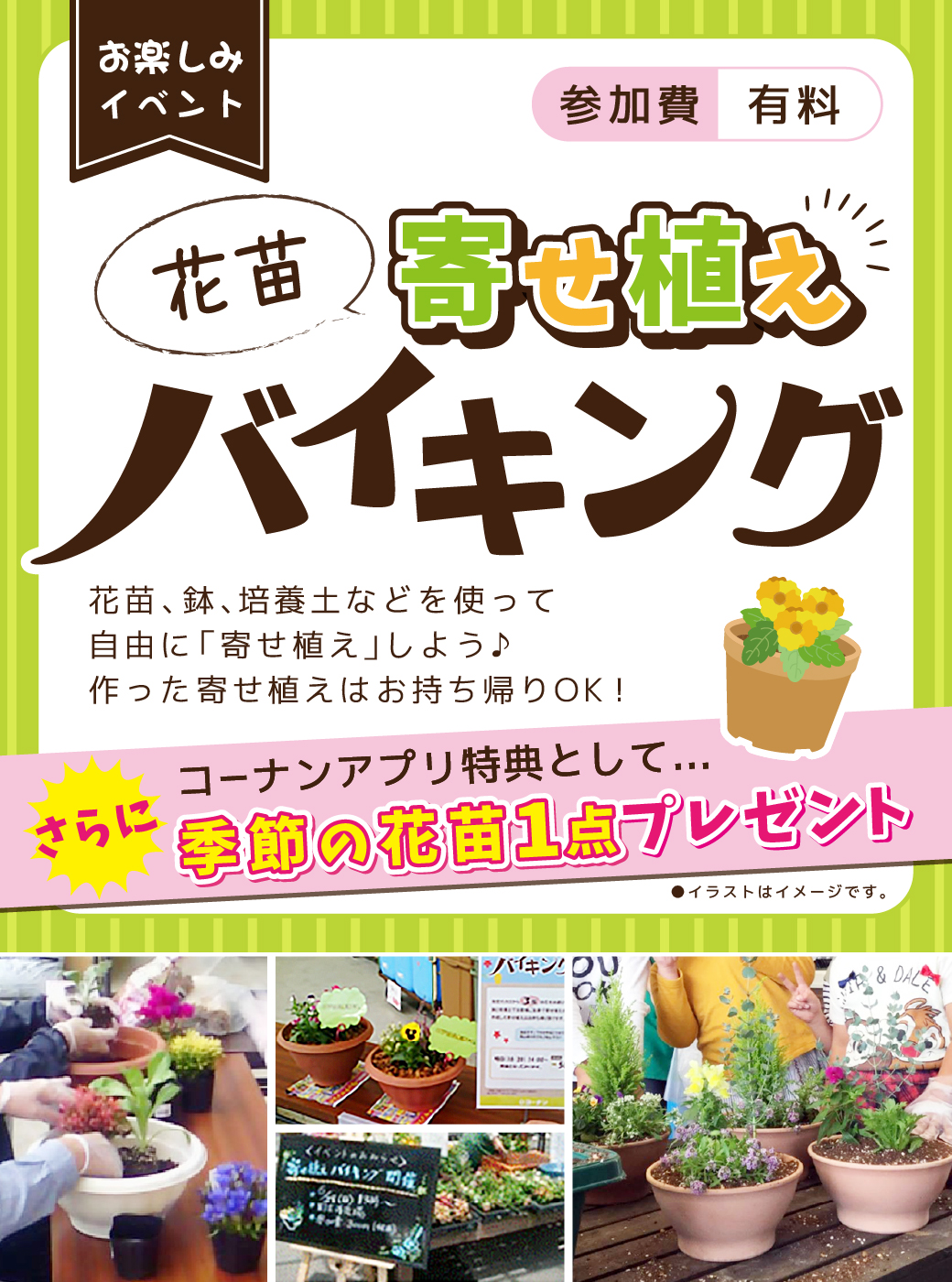 | 花苗寄せ植えバイキング | 4/19(日) | ①11:00~ ②14:00~ |