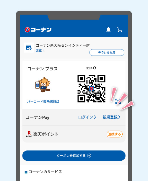 ※ コーナン プラスをご利用中で、コーナンPayのご利用登録がお済でない方はこちらをご確認ください。