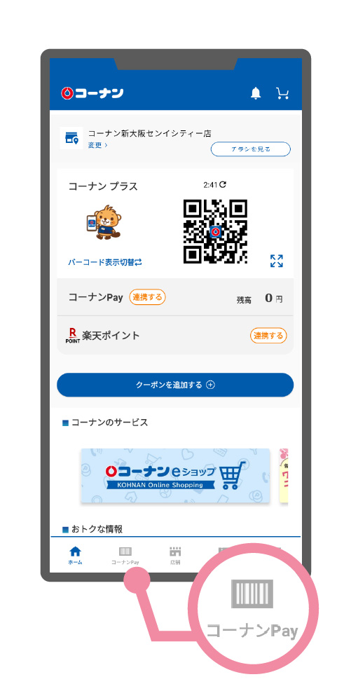 コーナンPayとコーナン プラスを連携すると、お買い物の際一度の会員コードの提示でコーナン プラス会員限定クーポンのご利用も、コーナンPayでのお支払いもできて便利です。