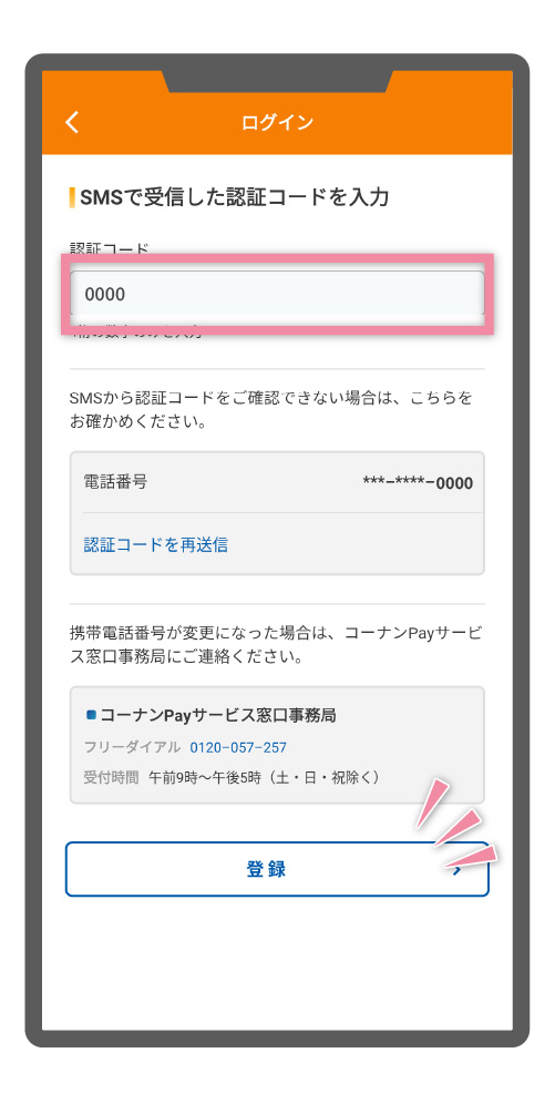 コーナンアプリの認証コード入力欄に、SMSで受信した4ケタの数字をご入力の上、画面を下方向にスクロールして「登録」ボタンをタップします。