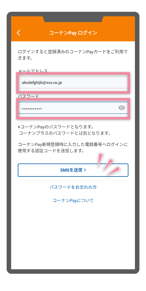 コーナンPayモバイルカード初回登録時に入力いただいたメールアドレスと、パスワードをご入力の上、二段階認証に必要な認証コードを取得するために「SMSを送信」ボタンをタップします。