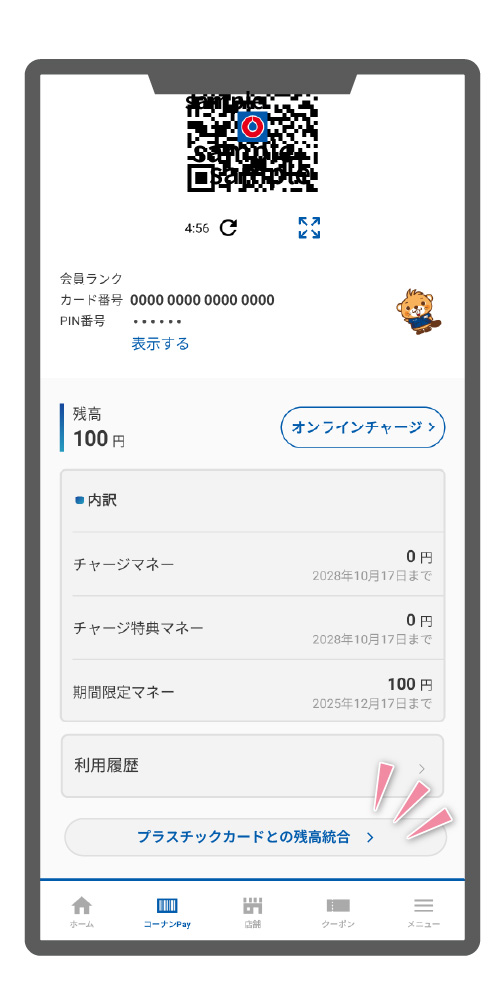 コーナンPayメニュー画面の一番下にある「プラスチックカードとの残高統合」をタップします。