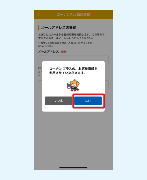 コーナン プラス会員登録手続きの際にご入力いただいた情報を使用してコーナンPay会員登録を進める場合は「はい」を押下します。