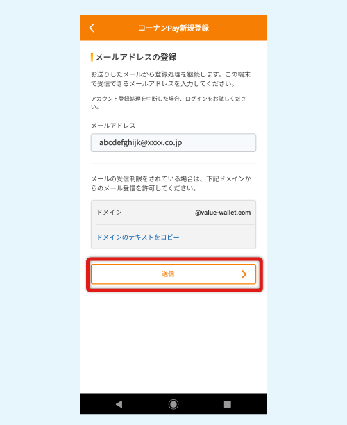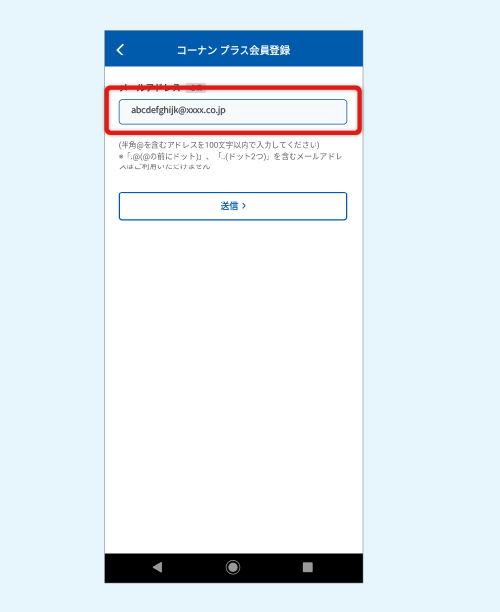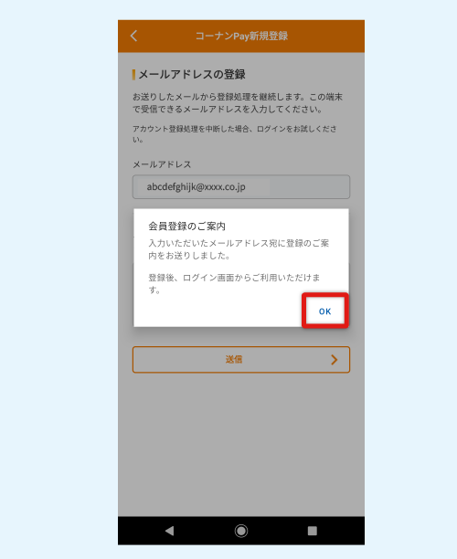 コーナンPay本登録用のリンクをメールでお送りしますので、メールアドレスをご入力の上、「送信」ボタンを押下してください。
