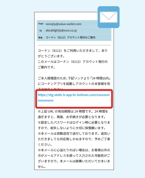 入力いただいたメールに届いた認証メールの本文中にあるリンクをタップするとコーナンアプリに戻ります。