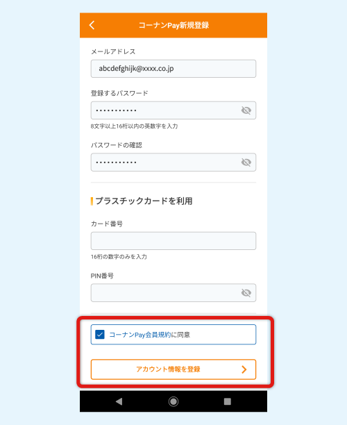 メールアドレスとコーナンPayで使用するパスワードをご入力いただき、「コーナンPay会員規約」をご確認の上、同意のチェックを入れたら「アカウント情報を登録」ボタンを押下します。