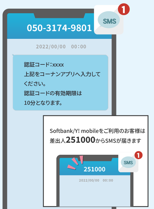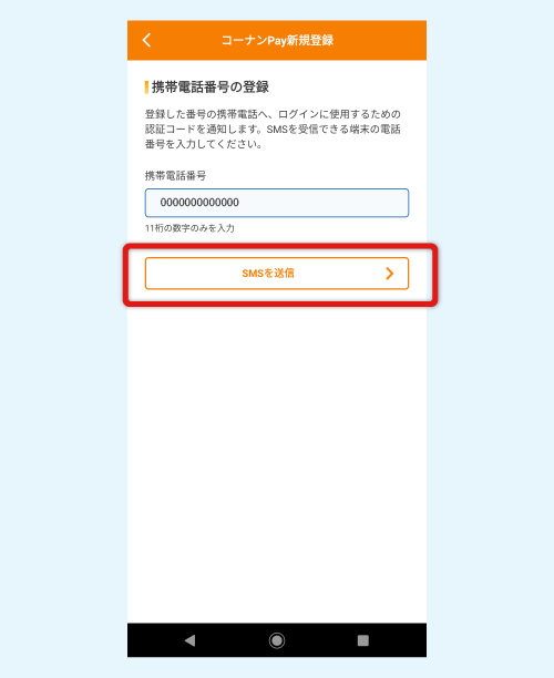 コーナンPayは多要素認証を採用しており、SMS(ショートメッセージサービス)にて認証コードを送付します。