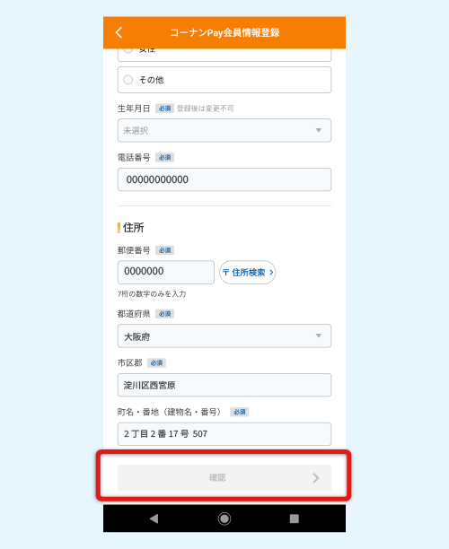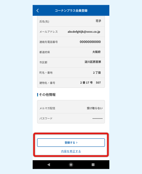 コーナンでのお買い物が便利になるコーナンPayの会員登録をこのまま進める場合は「登録する」を押下します。