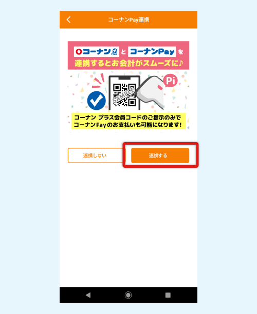 コーナンPayをご登録済の方にはコーナンPayとコーナン プラスの連携確認画面が表示されますので、「連携する」「連携しない」のいずれかを押下します。
