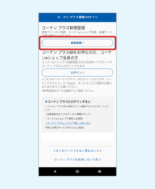 コーナン プラスの登録画面に切り替わったら「新規登録」を押下します。