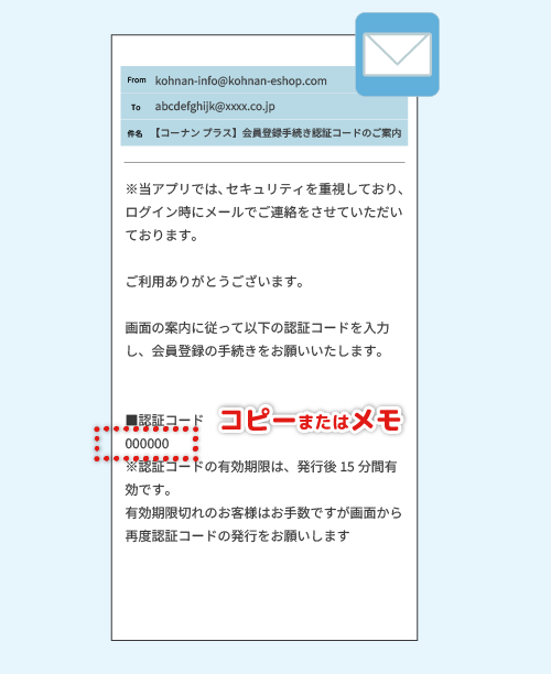 本文中にある数字6桁の認証コードをコピーまたはメモをしてコーナンアプリに戻ります。