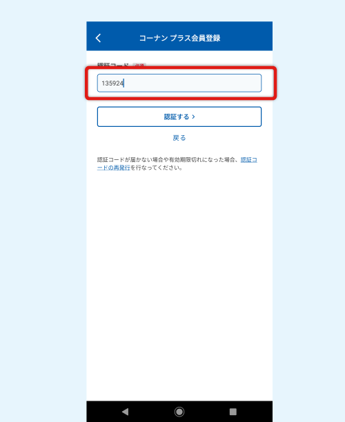 コーナンアプリに認証コードを入力し、認証するボタンを押下します。
