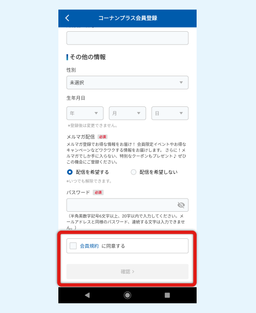 最後にコーナン プラスの「会員規約」をご確認いただきご同意のチェックをお願いいたします。