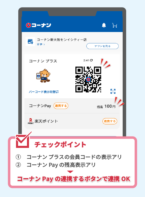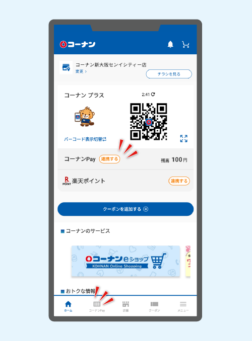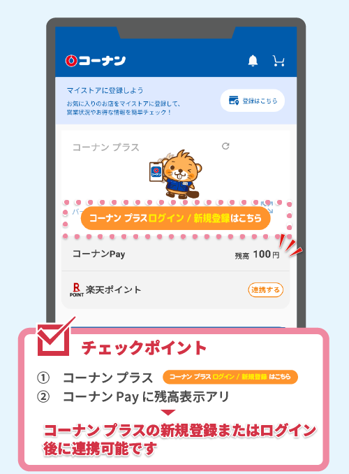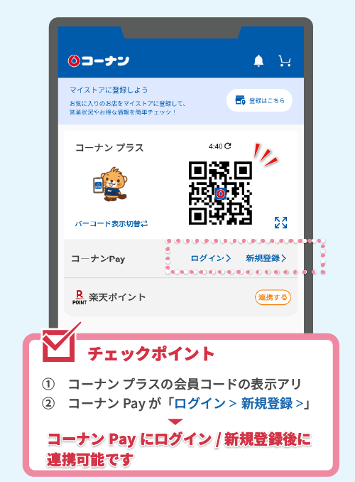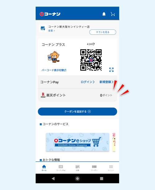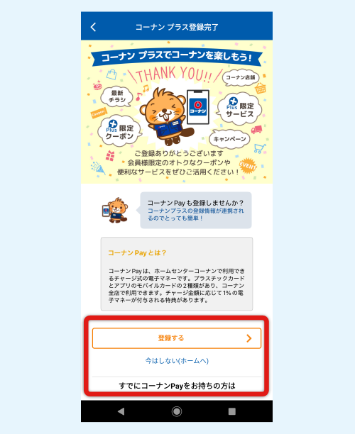コーナンPayとコーナン プラスは別に登録が必要です。