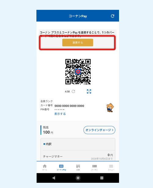 コーナンPayのQRコードの上にある「連携する」ボタンを押下します。