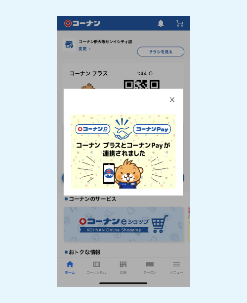 コーナン プラス、コーナンPayのいずれかのサービスをご利用で、上記以外のホーム画面表示の方、