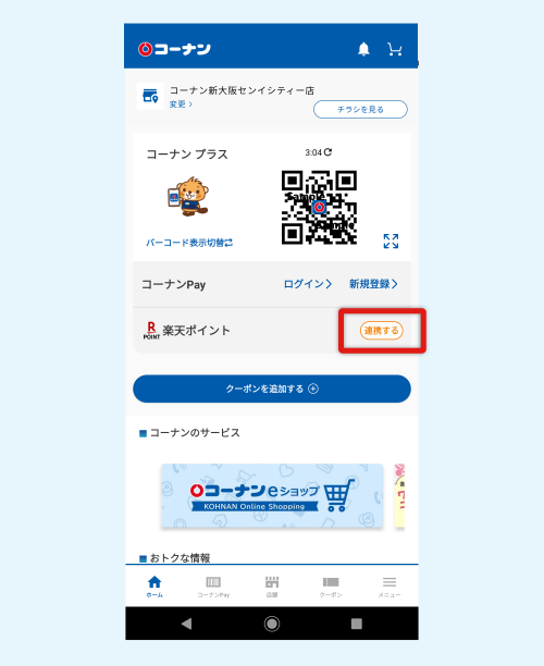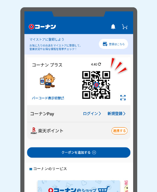 クーポン等コーナン プラスのサービスをご利用の際はコーナンアプリでのログインが必要です。